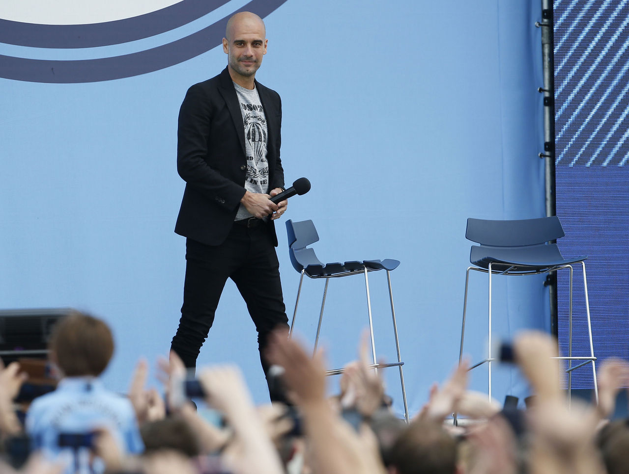 The festivities for City's new addition took place on Sunday afternoon at the Cityzens' Weekend, as Guardiola was introduced to the club's supporters on a stage outside the Etihad Stadium. However, rather than carrying him upon shoulders while feeding him grapes, the unveiling was a somewhat informal affair, evidenced by the Catalan manager's casual attire and questions from a select group of fans instead of the press.