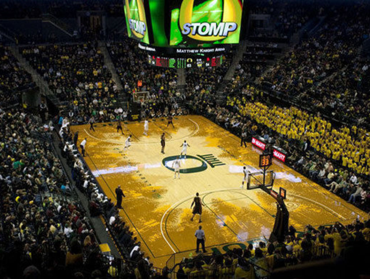 What is it about the Pacific Northwest and an inability to leave well enough alone? Sure, it's Eugene Oregon so you gotta have some trees on the basketball court. This abomination looks like someone spilled some bleach on a pair of Carhartts. Try again.