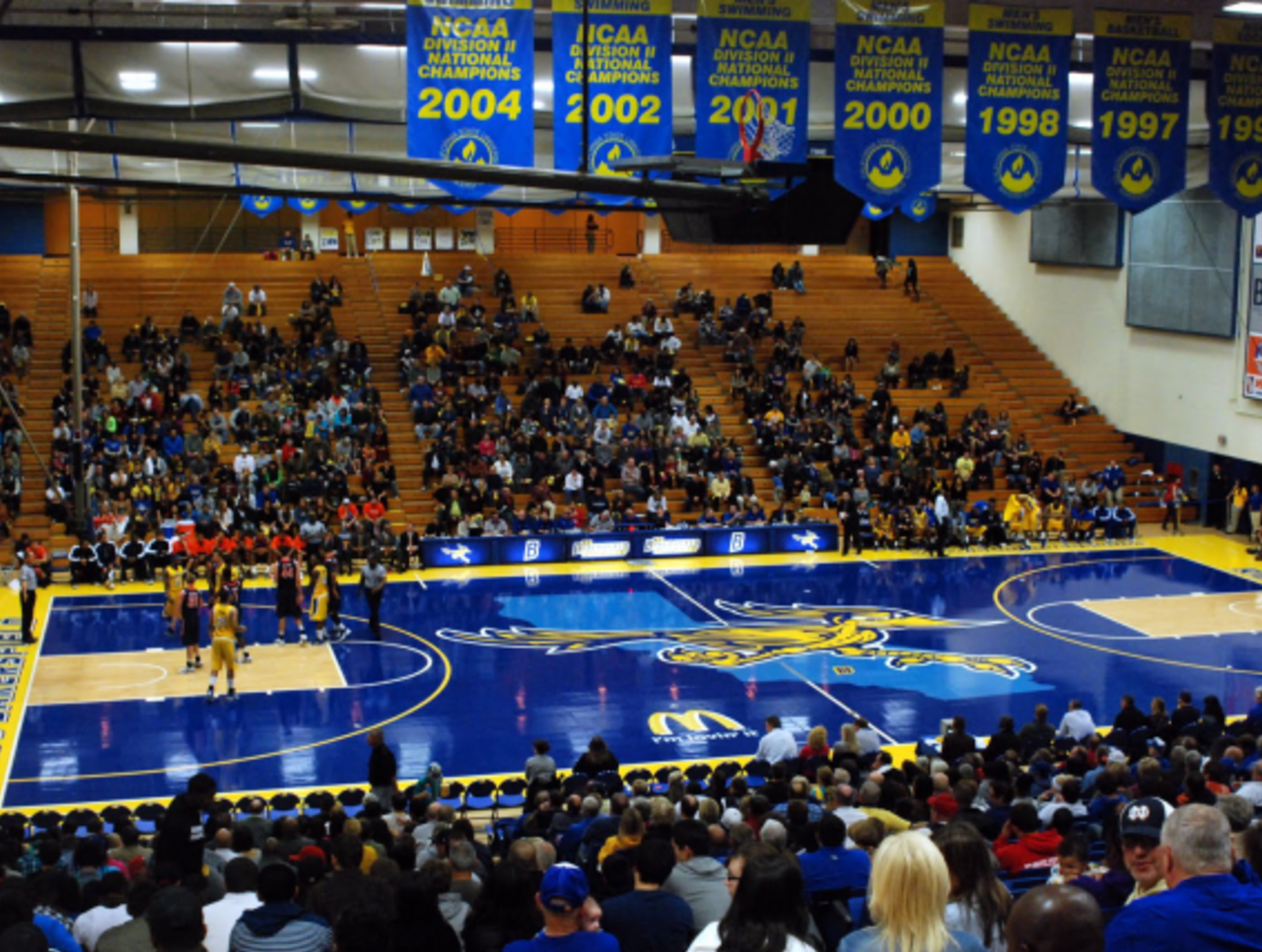 The Cal State-Bakersfield Roadrunners play on this vibrant blue and yellow basketball court, complete with McDonald's Golden Arches via a sponsorship agreement. Northwestern pitched a purple court design a few years ago but never followed through on it. Kudos to CSU Bakersfield for pulling it off... I guess.