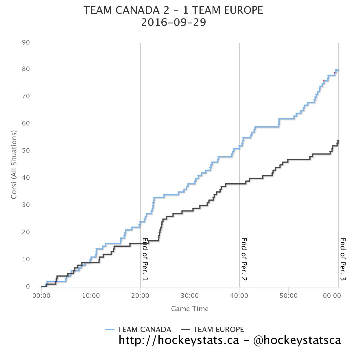 Still, at the end of 40 minutes of play, Europe held the 1-0 lead while outshooting Canada in each of the first two periods.