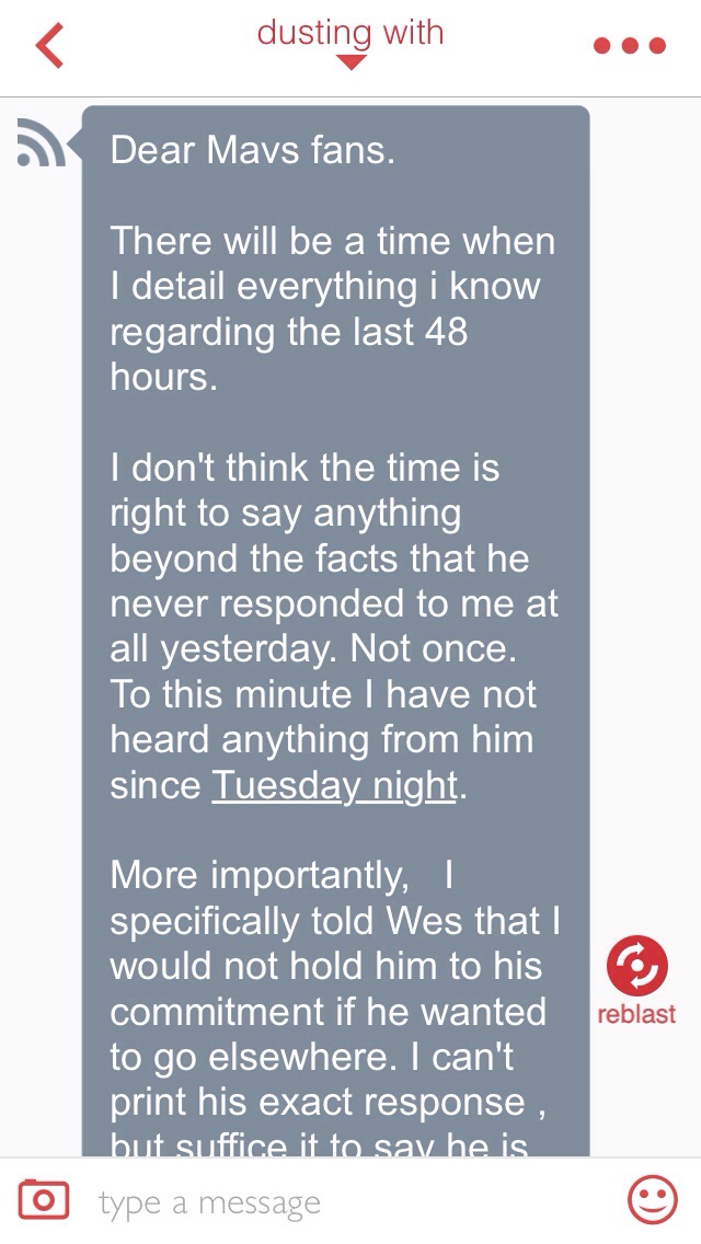 An irate Cuban sent out a note via the Cyber Dust messaging app to Mavericks fans detailing his thoughts on the Jordan situation.