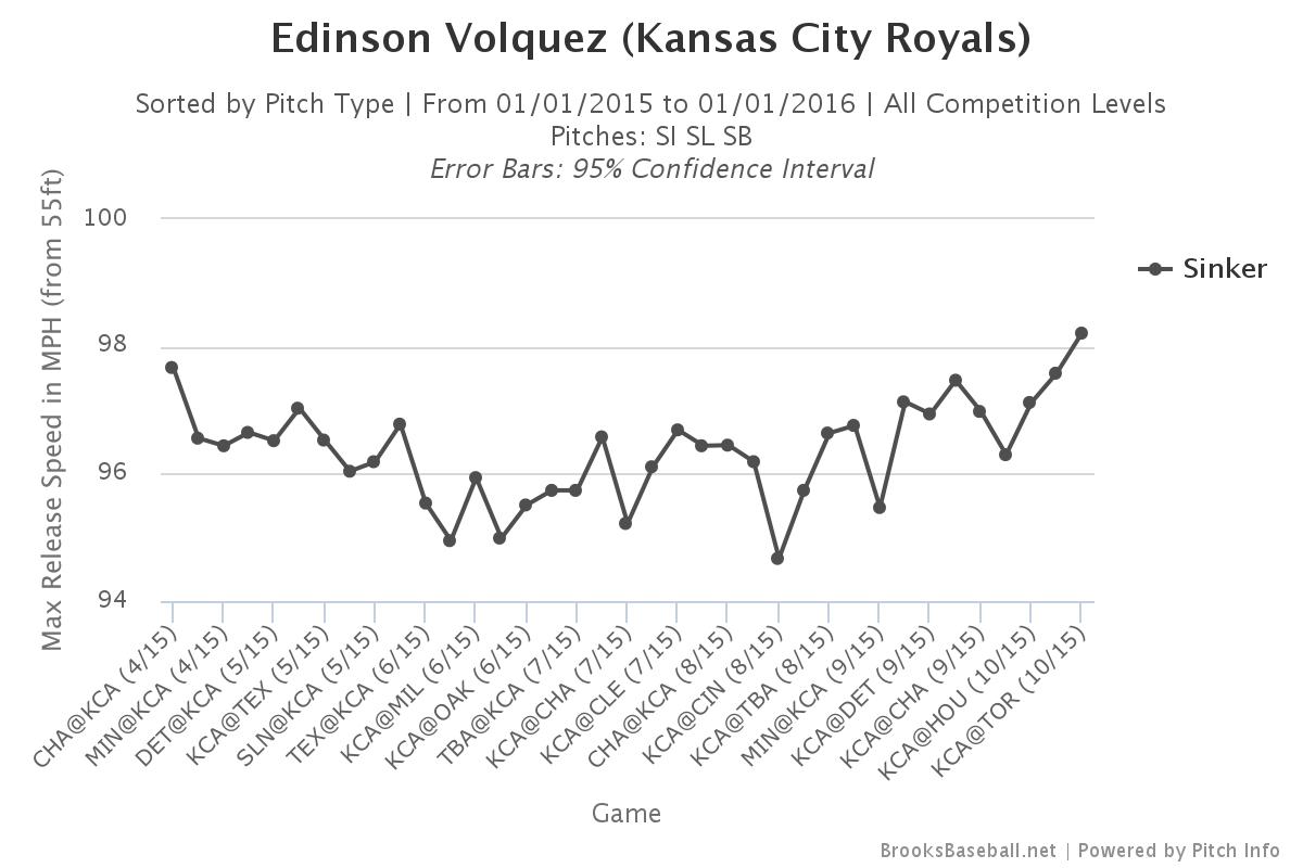 In Game 1 of the American League Championship Series, Volquez threw a pair of sinkers against the Toronto Blue Jays upward of 97 mph despite averaging only 94.4 mph with the pitch during the regular season. Five days later, in Game 5 at Rogers Centre, the former All-Star unloaded a whopping 17 pitches of at least 97 mph, touching 98 three times.