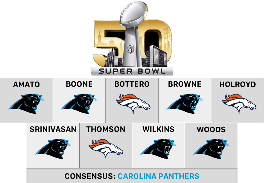 The staff at theScore put on their prognosticator hats and made predictions for Super Bowl 50, highlighting reasons for their choices. The pickers are Gino Bottero, Caitlyn Holroyd, Justin Boone, Arun Srinivasan, Joe Thomson, David P. Woods, Michael Amato, Jack Browne and Dan Wilkins.