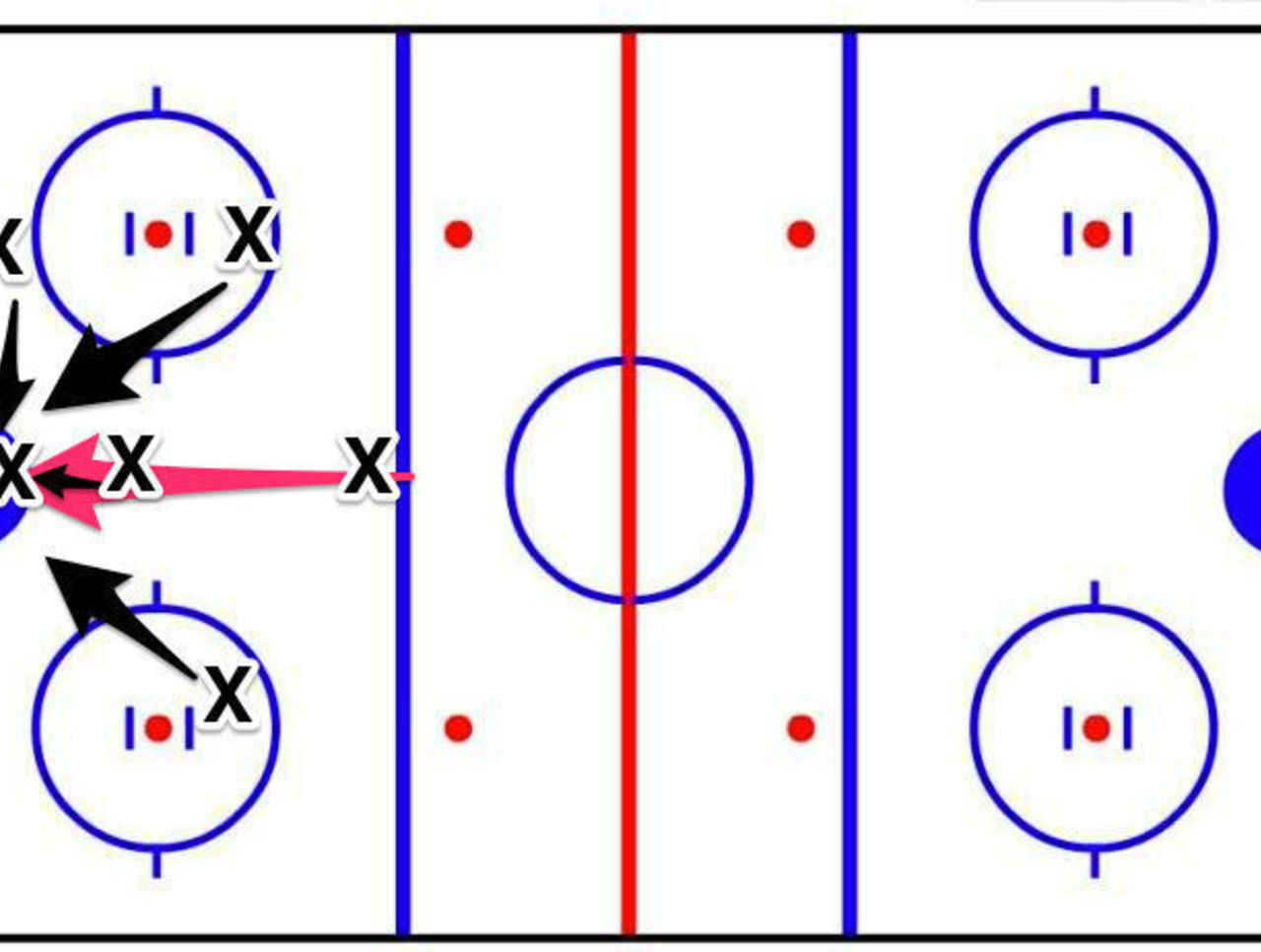 * Screens: The offense is trying to get pucks on net, so you want to take away the goalie’s eyes, which is why most teams will put up a double screen - one higher, and one right on top of the goalie. Those guys combined with defenseman covering them makes for a mess of humanity right in front of the goalie, and that’s a good thing.