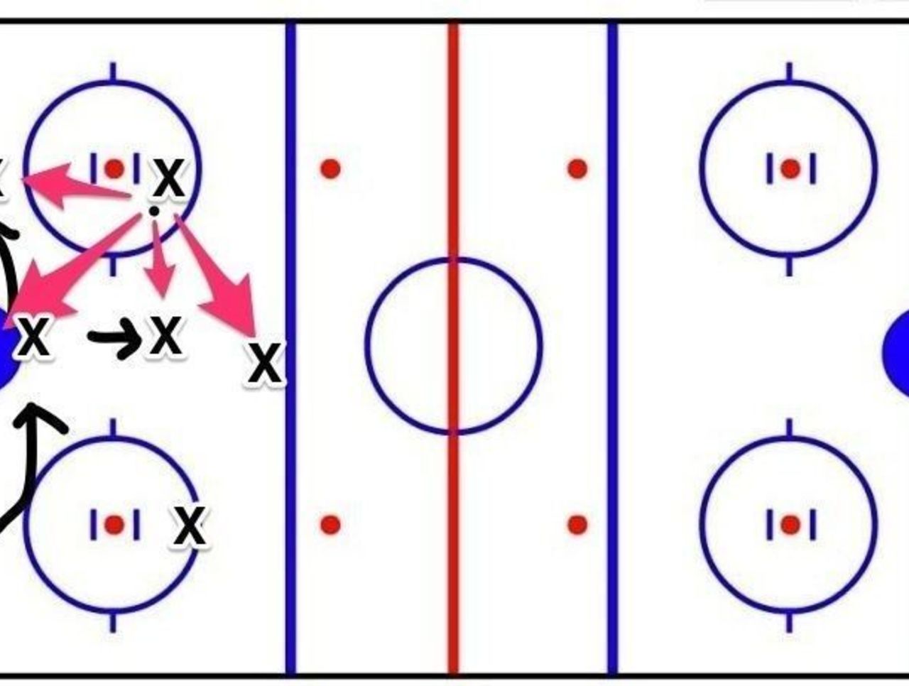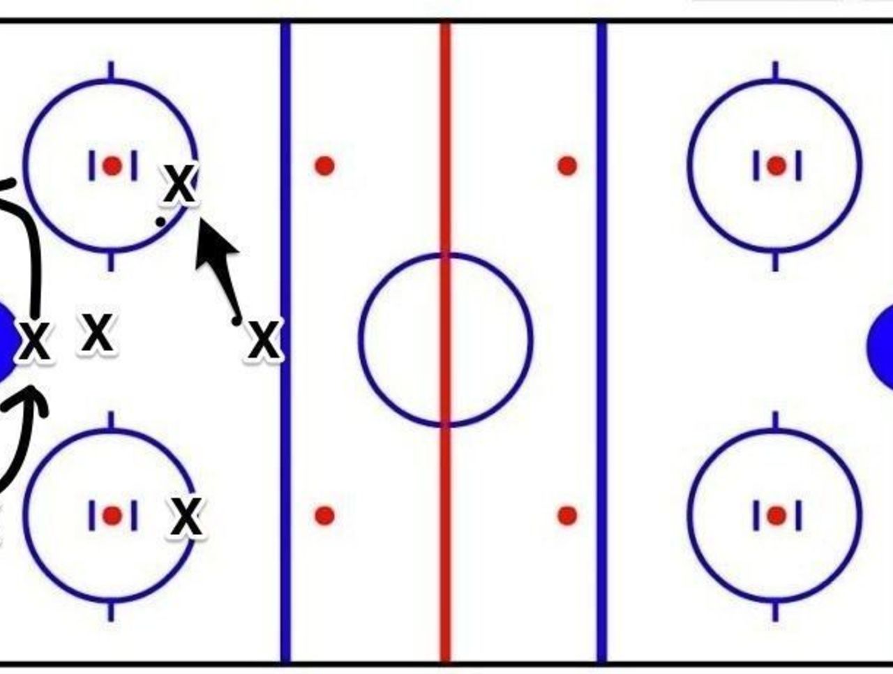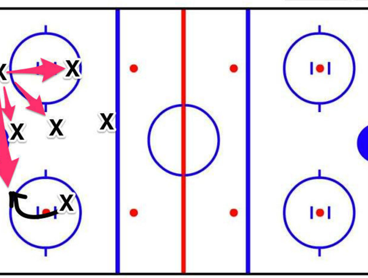 The player on the goal-line will then decide to either take the puck to the net, find a pass, or skate up to where the half-wall player just was, move the puck up high, and carry on. (The half-wall player would then take up the spot on the goal-line/net front.)