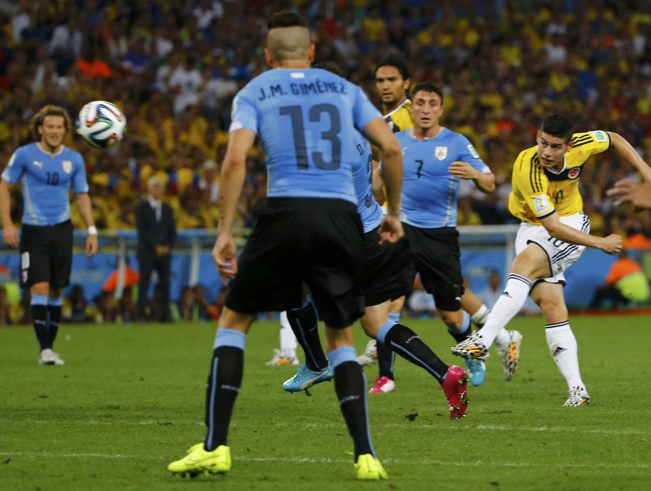 In terms of difficulty and importance, James Rodriguez's goal against Uruguay in the round of 16 solidified his spot on the world stage after receiving praise for his remarkable performances in the group stage. Rodriguez calmly corralled a pass with his chest and launched the ball toward the net before it hit the ground. The Uruguayan keeper got a touch with his fingertips, but the ball slipped under the crossbar and gave his country the lead. It was his first of two goals in the match as Colombia advanced to the quarterfinals.