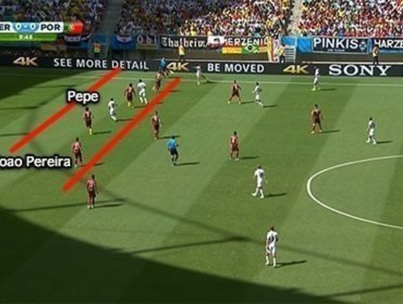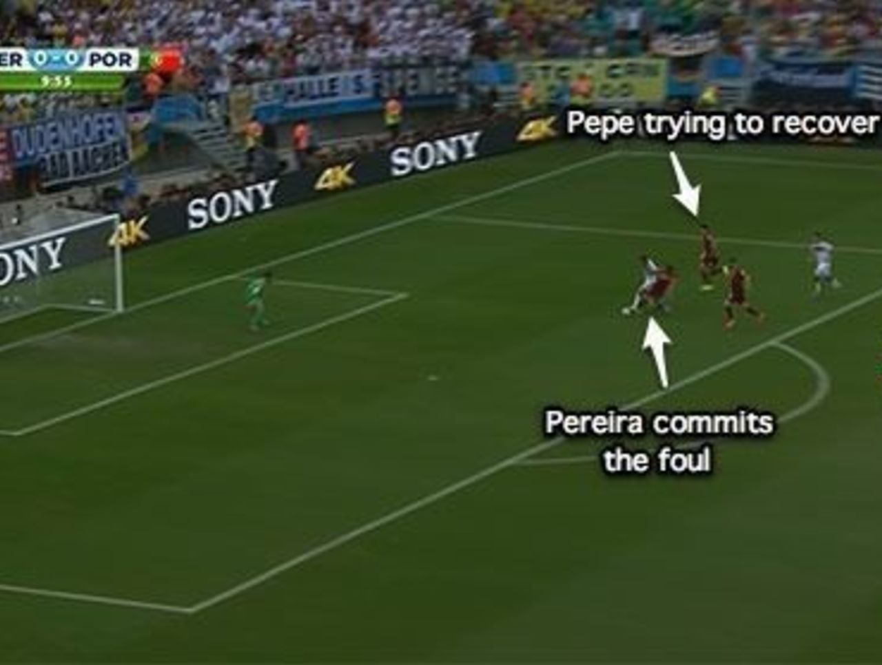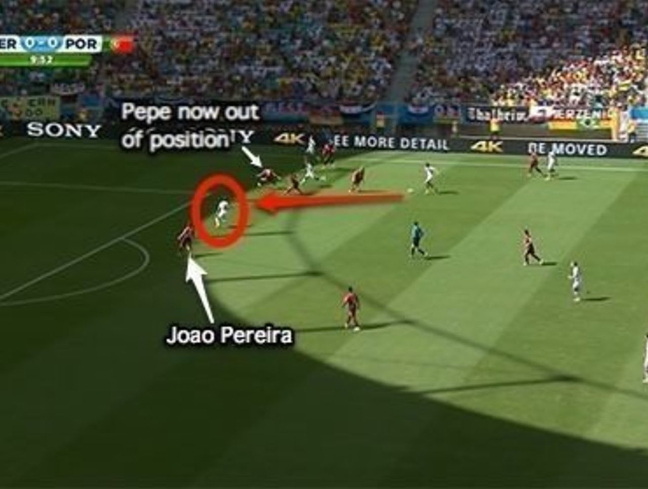 Now, let's look at how the play developed, which will show how a lapse in judgement by Pepe (sounds about right) opened up space for the through ball that ultimately led to the foul on Mario Gotze.
