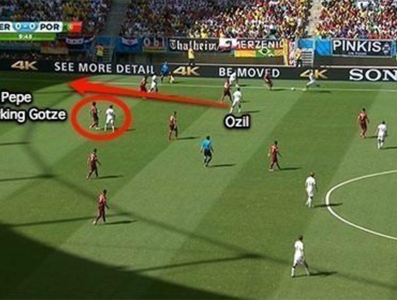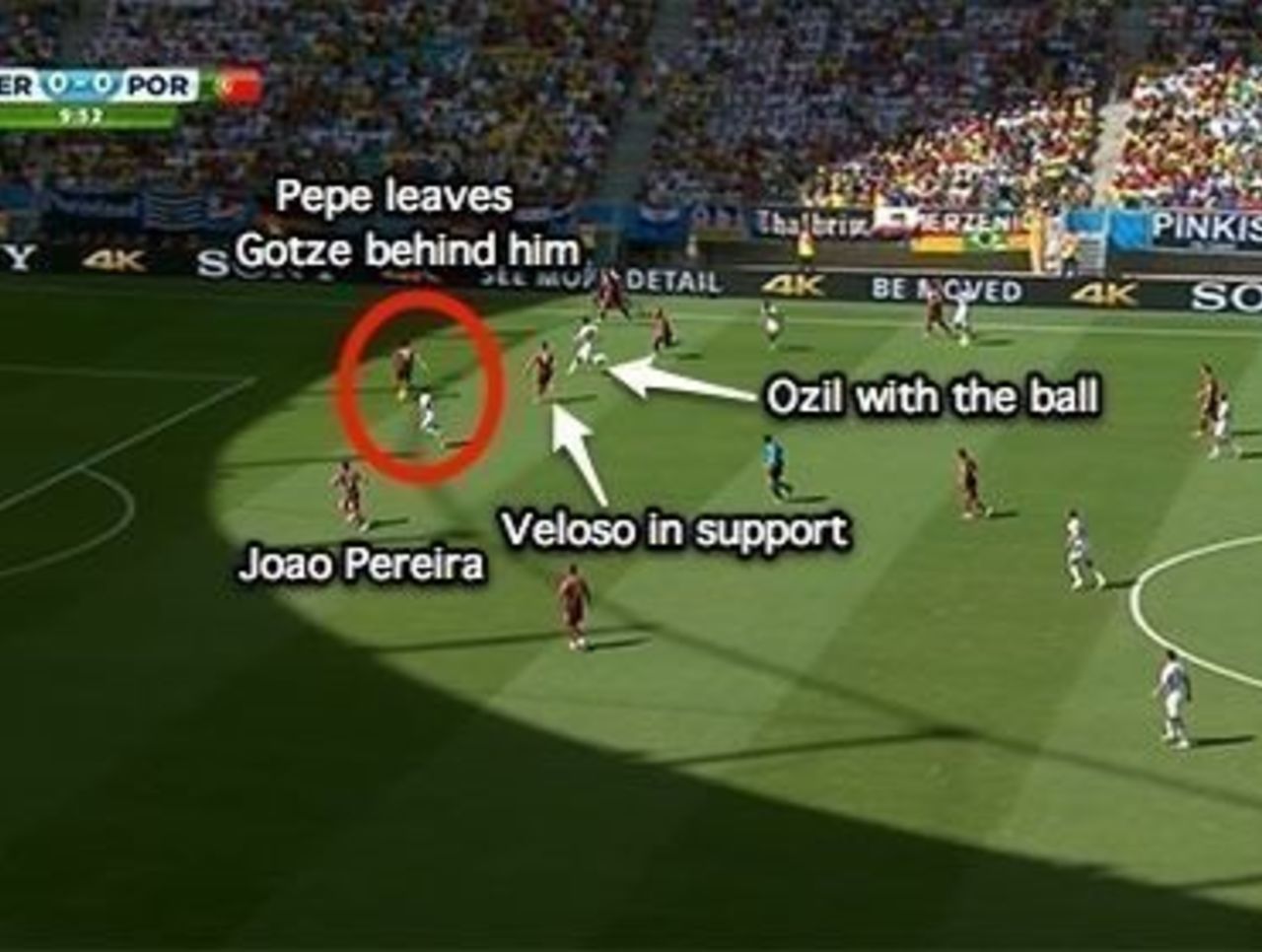 When Ozil receives the pass, Pepe leaves Gotze and comes across to cut off the midfielder, which is the key mistake in the sequence.