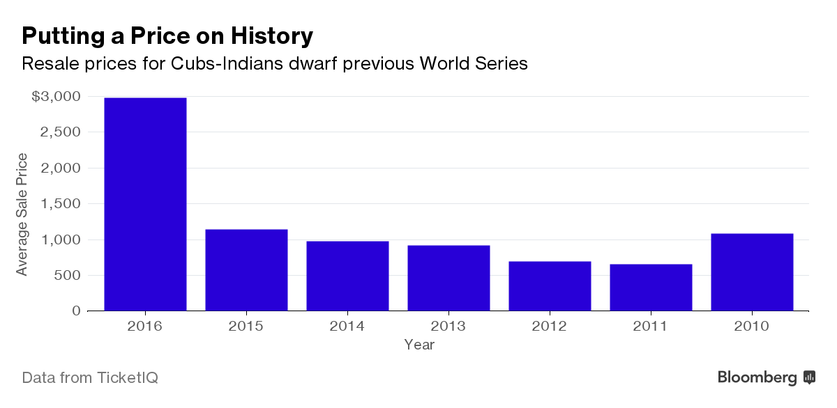 The most expensive pair of tickets were going for $30,000 apiece, located in the dugout box. On average, 2016 World Series tickets have sold for $2,983.46, the highest in league history, according to Eben Novy-Williams from Bloomberg with data from Ticket IQ.