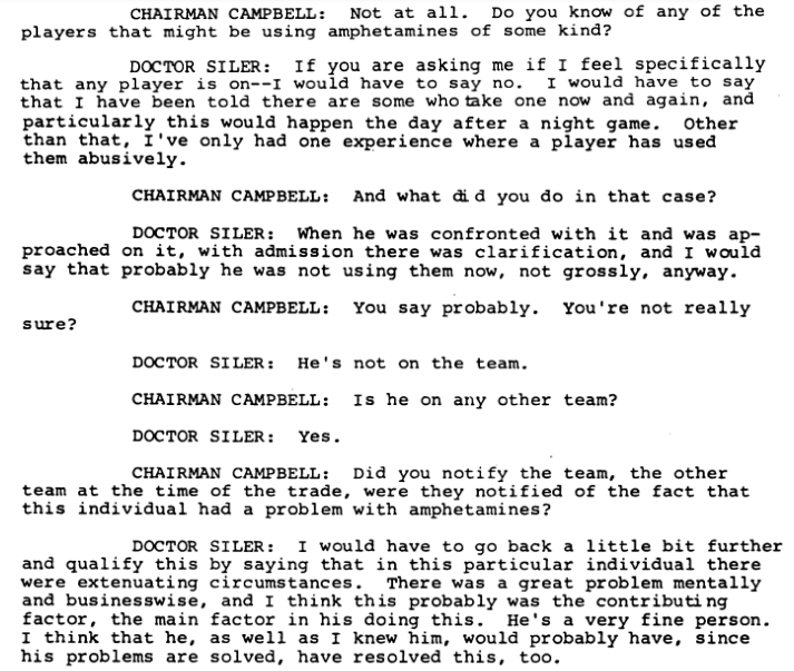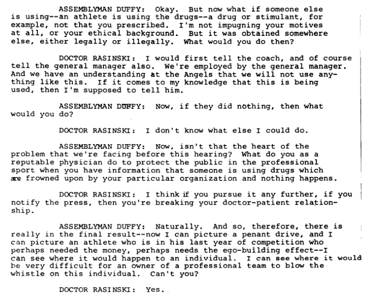 Team doctors for the then-California Angels and the San Francisco Giants appeared at the hearing. The pair shared the same general sentiment. Angels doctor J.V. Rasinksi insisted that neither the team nor the sport as a whole had ever experienced a major drug issue. Giants doctor Eldor Siler said his athletes were treated "much the same as we would use in private practice," and said that while he didn't know if players were using amphetamines, "we do not have them available."