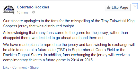 The Rockies released a statement regarding the typo, saying the club was aware of the misspelling but decided to move forward with the promotion to avoid disappointing fans.