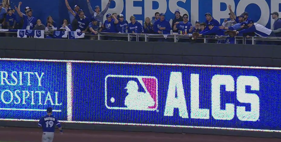 Moustakas' ball was caught by a fan sitting in the right-field seats, before officially clearing the wall. The play was initially ruled a home run and the call was upheld following a review, which appeared to show the ball was on trajectory to clear the wall before being interfered with.