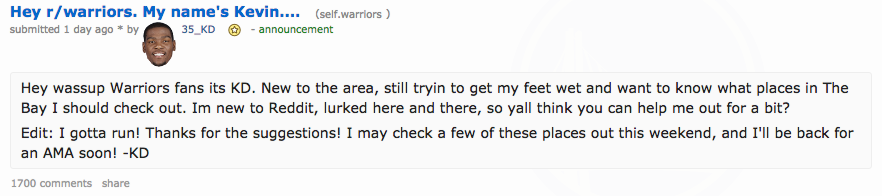 So on Friday, Durant stopped by the Golden State Warriors subreddit to get some ideas on places he should check out in the Bay Area. His appearance came as a big surprise, and Redditors were all too happy to offer up suggestions.