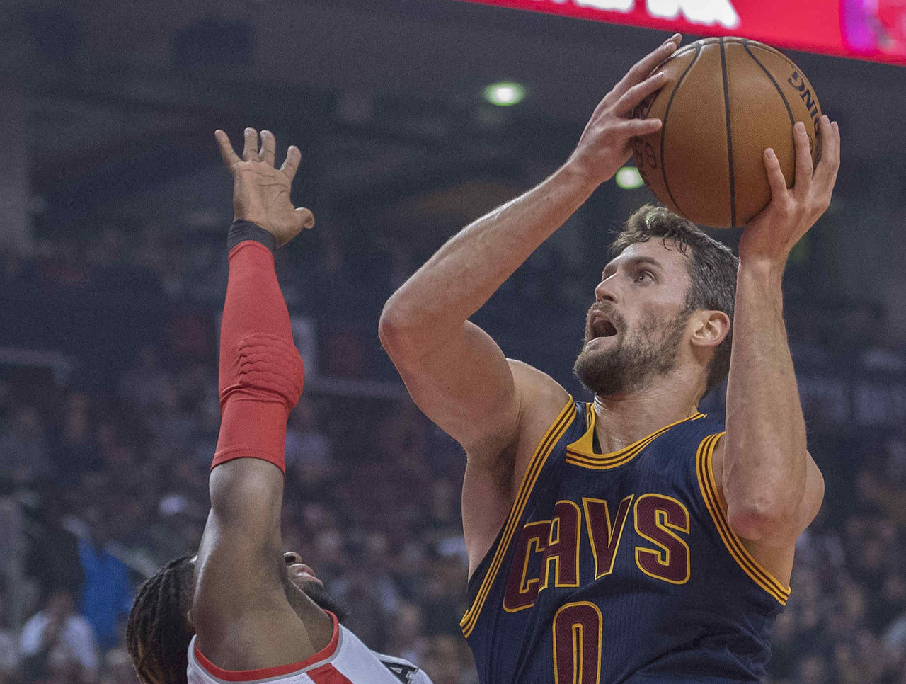 Same story, different day, different big man. In recent games it's been Channing Frye stretching the Raptors' frontcourt to its breaking point, and torching them from deep. On Monday night, it was Kevin Love.