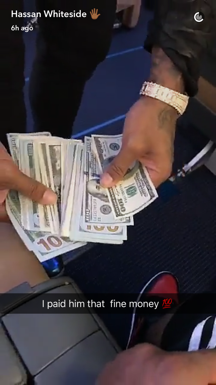 Whiteside, who re-upped with Miami on a $98-million deal last summer, posted a video Tuesday of him giving Johnson cash to cover the $25,000 fine he picked up for going after Prince.
