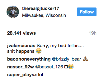 P.J. Tucker called out Valanciunas on Instagram for letting out a midair fart, posting a hilarious video of several players covering their noses. Serge Ibaka was particularly angry.