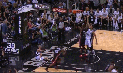 Then there were the two daggers in the final minute or so that put the game away, with James, Chris Bosh and Dwyane Wade all lending a hand. First, with the Heat down one (93-92) and 1:17 remaining, James got to the heart of the defense (thanks to a handsy screen on Tony Parker by Mario Chalmers), drew Tim Duncan off of Bosh, and found Chris open in the corner for the go-ahead three-pointer: