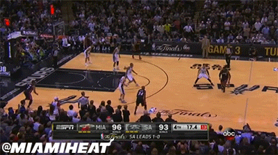 With the Heat up three (96-93) and about 10 seconds remaining, Bosh made Duncan pay for coming out to guard him on the perimeter by crossing over The Big Fundamental and then dropping a gorgeous bounce pass to Wade: