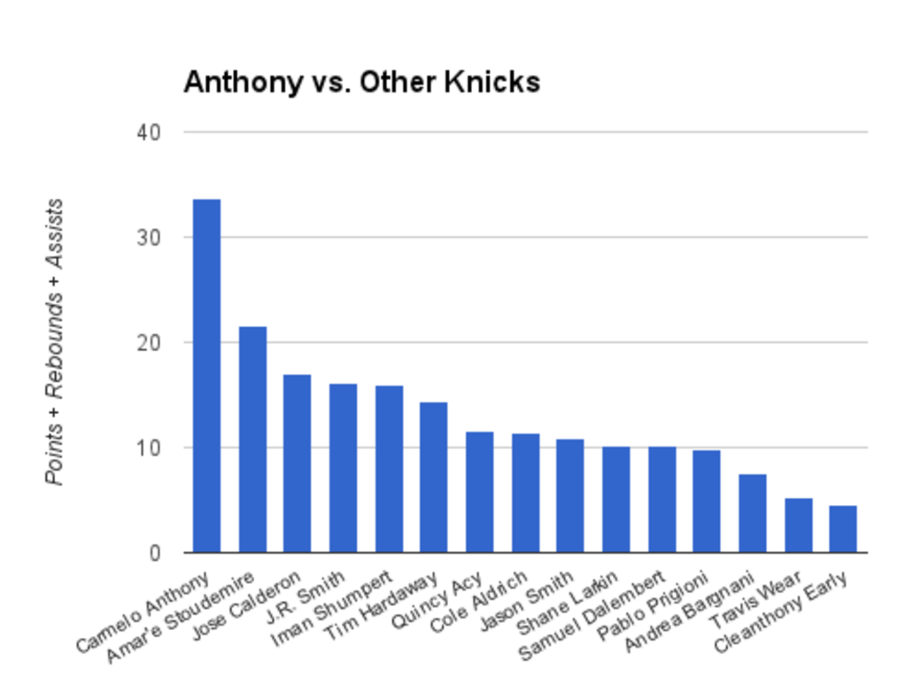 The reasonable course for the Knicks would be to sit Anthony down, affording him 10 months to explore options with the knee and begin rehabilitation before the 2015-16 season. He remains an excellent offensive player and the team scores 11.1 points per-100 possessions more when he's on the floor, but that's only been enough to nudge them from awful to bad. There is a 35-game sample of evidence to suggest the Knicks aren't any good with Anthony, so continuing to play him 36.1 minutes a night just to suffer narrower losses is short-sighted.