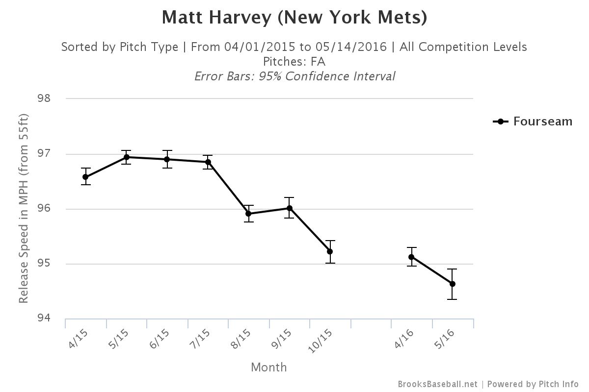 Harvey's struggles have been accompanied by a recent dip in velocity, perhaps a symptom of faulty mechanics the right-hander said Friday were "progressively getting worse as the game goes on." Last year, Harvey's average four-seam velocity was over 96 mph while reaching a top speed of 100.2 mph. Those readings are down nearly two miles per hour this season, respectively, according to Brooks Baseball.