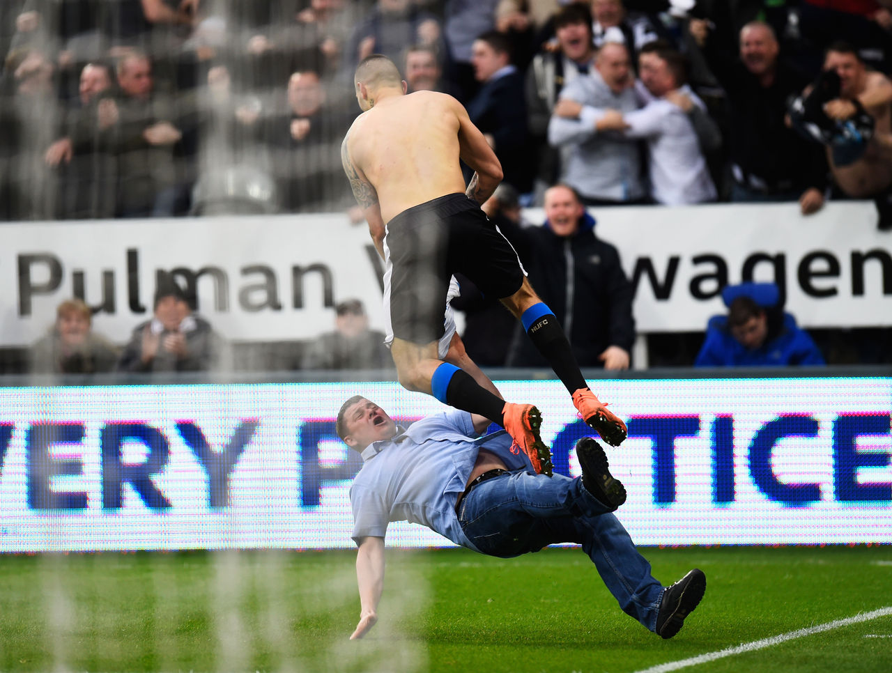 Magpies forward Aleksandar Mitrovic scored a late equaliser in the 156th installment of the Tyne-Wear Derby in March, and his shirtless celebration was capped off by a pitch invader whose attempt to hug the ebullient Serb nearly resulted in disaster.