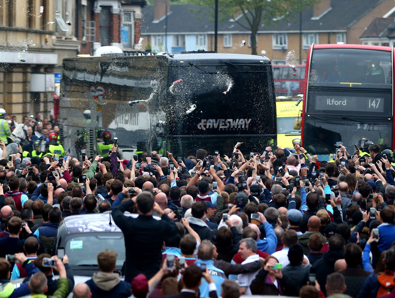 An emotional, joyous evening turned sour ahead of West Ham's last-ever Premier League match at the Boleyn Ground, with supporters pelting Manchester United's team bus with bottles and other projectiles as the Red Devils arrived (late) for the contest.