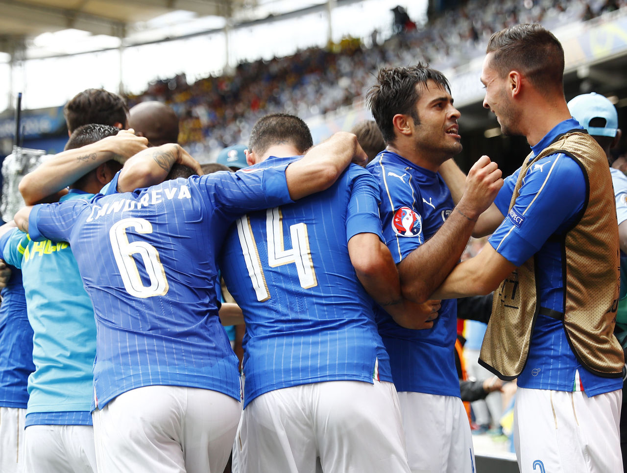 But the Inter striker had the Italy bench celebrating wildly on the pitch at the Stadium de Toulouse with a well-taken 88th minute strike after running on to Simone Zaza's header to beat Andreas Eriksson at his far post.