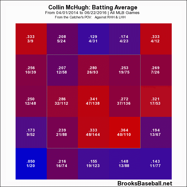 Assuming there isn't a drastic change in McHugh's repertoire, approach or ability, the only option is to keep dancing on the edge of the zone, drawing weak contact. To that end, it's a terrible sign that his hard-hit rate has risen from 19.7 percent in 2014 to 21.3 percent last season, to a whopping 30.1 percent in 2016.
