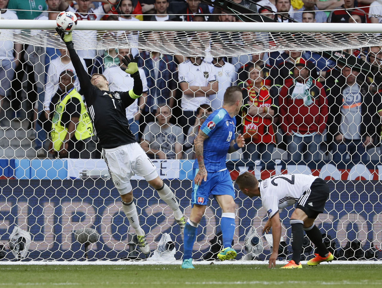 Slovakia came close to breaching the German defence when Juraj Kucka leaped above his marker and got on the end of a cross into the box, only to see Manuel Neuer pull off a great diving save.