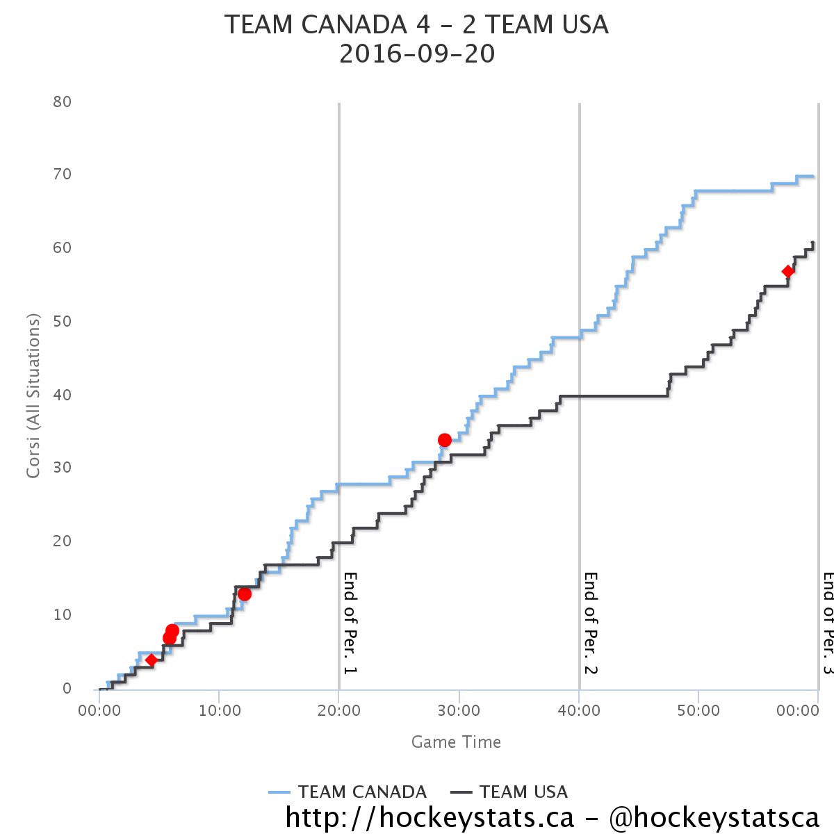 The shot count finished 34-27 in Canada's favor, with the shot attempts painting a fuller picture of which team won the possession battle.