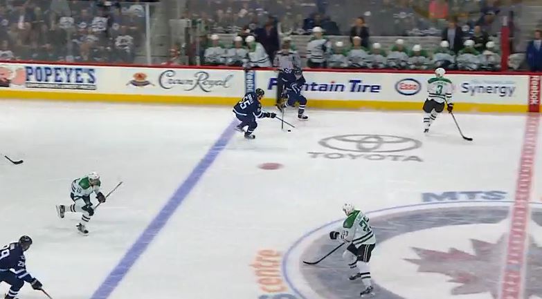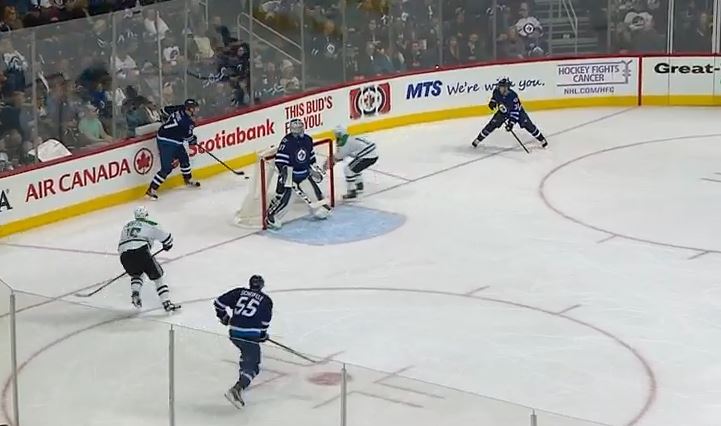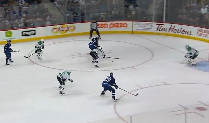 Both Mark Scheifele (55) and Nikolaj Ehlers (27) were in position to gather the puck, but Scheifele as the center wisely deferred to Ehlers at the wing in order to spread things out and keep Dallas' defense on its toes.