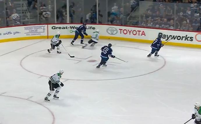 Instead of dumping the puck deep into the offensive zone, Ehlers threaded a pass to Scheifele, who was able to cut between the defensive pairing of John Klingberg (3) and Esa Lindell (23) as a result of the winger carrying the play.