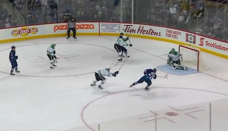 What's interesting to note here is that Patrik Nemeth (15) was on Laine's tail as a defenseman who's been forced to play forward as a result of a bevy of Dallas injuries up front.