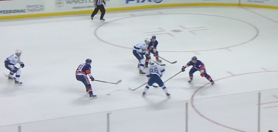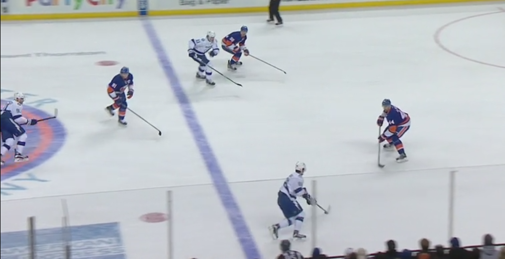 Kucherov gobbled up the puck, and skated with haste down the ice. He entered the Islanders' zone with Boyle to his left, and Stamkos (91) - who was being watched by John Tavares (also 91) - trailing behind.
