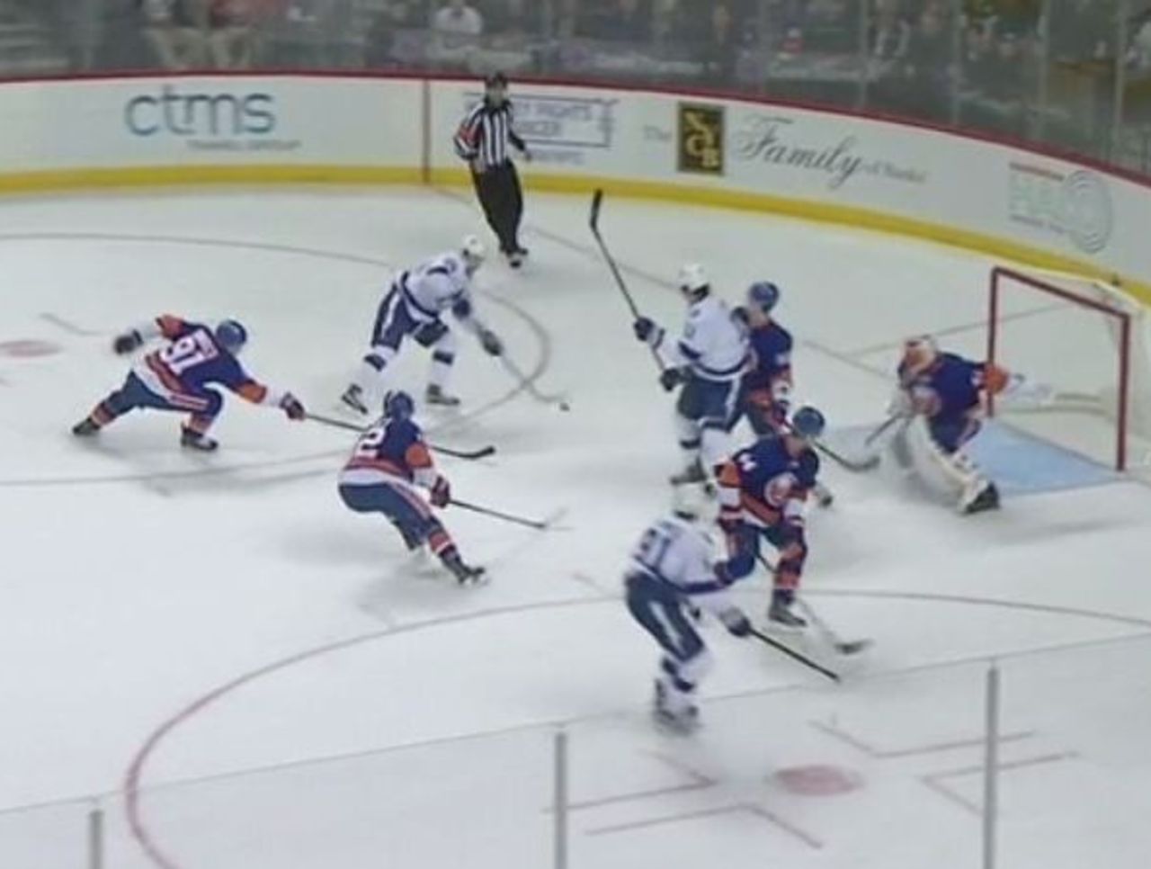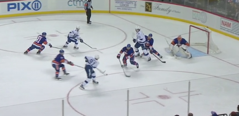 Kucherov skated toward Calvin de Haan (44), and instead of attempting a shot through a possible screen, he dropped the puck past Tavares and back to Stamkos.