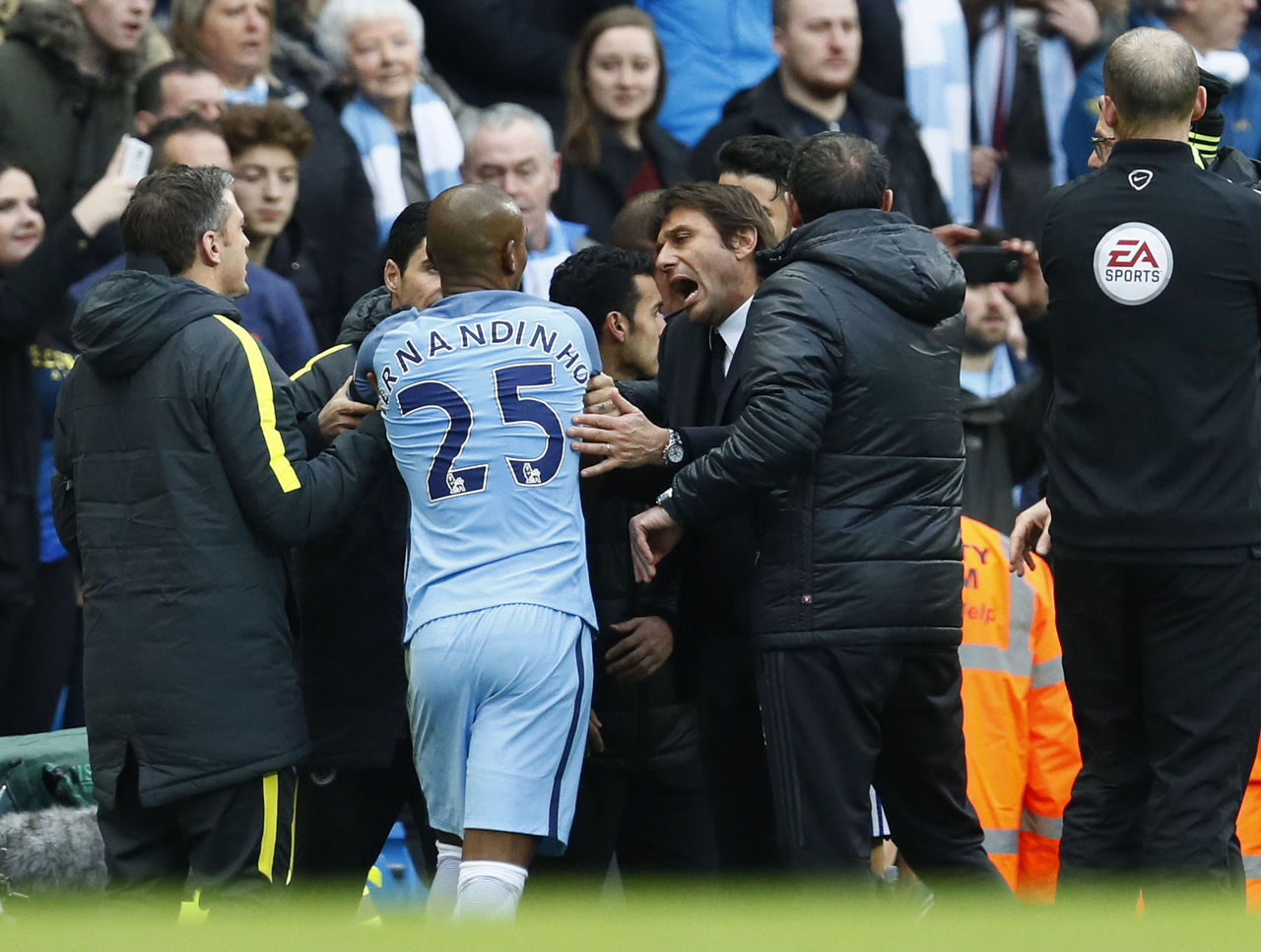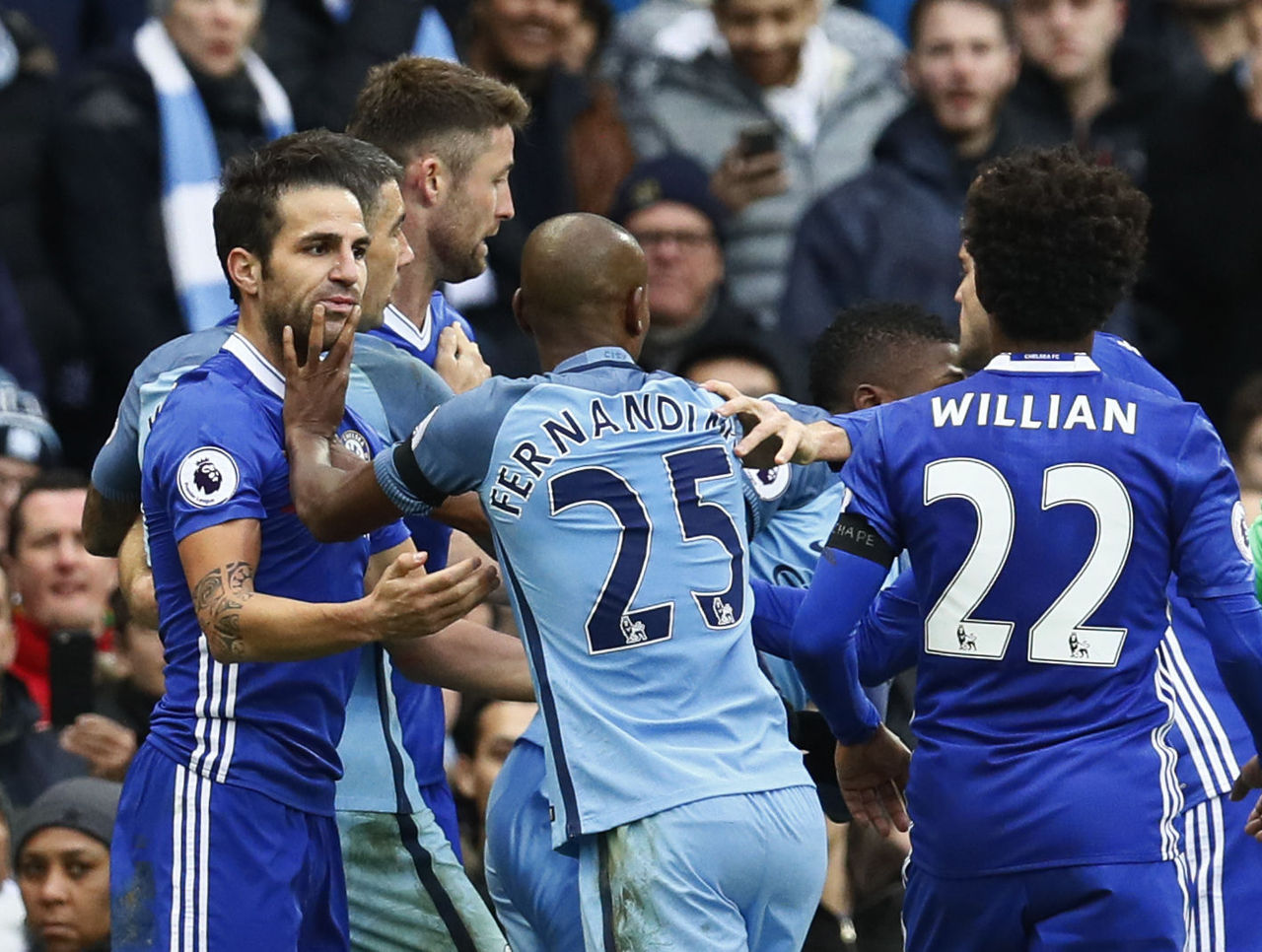 Amid the fracas, Fernandinho was also sent off for grabbing Cesc Fabregas by the throat, and giving him a slight shove over the advertising boards - which, in fairness, Fabregas seemed to embellish somewhat.