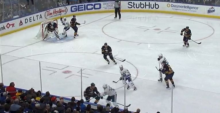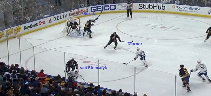 Bozak received Marner's pass, and positioned himself to either take a shot at a heavily-guarded short side or dish the puck to one of van Riemsdyk or Marner, both of whose paths to the net were impeded by Sam Reinhart (23) and Dmitry Kulikov (77).