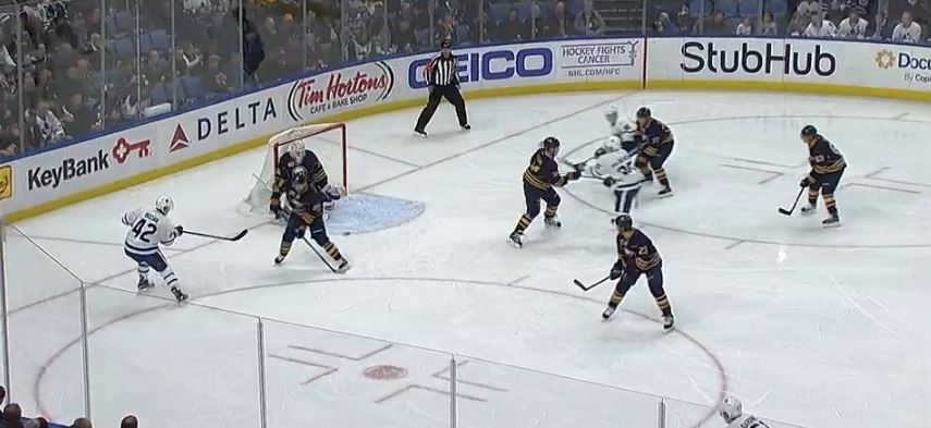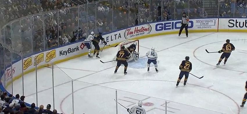 Marner slid into the corner to scoop the loose puck, commanding the attention of all six Sabres on the ice.