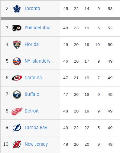Based on the advantage of having fewer games played, therefore, the Maple Leafs appear set to overtake the Boston Bruins for an Atlantic Division playoff spot, with the Flyers and Islanders directly in line to fight for that second wild-card spot, and the Hurricanes and Sabres not too far behind.
