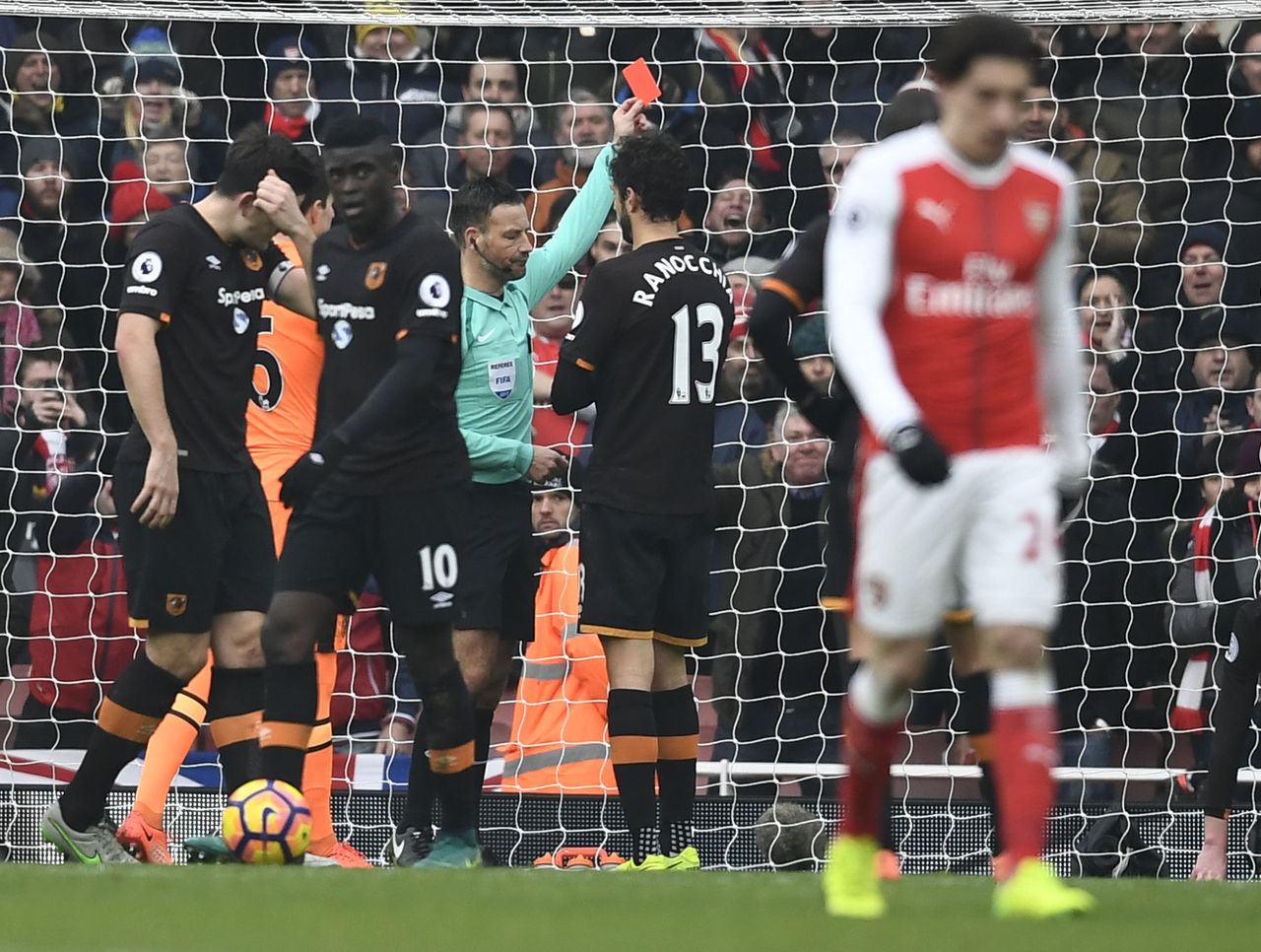 Earlier in the match, Arsenal winger Theo Walcott was lucky to avoid getting sent off when he threw the ball away out of frustration following a heavy challenge from Hull defender Harry Maguire.