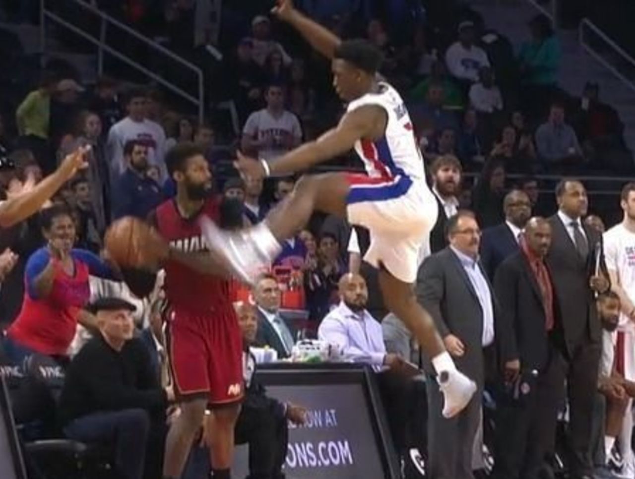 The Heat were inbounding the ball on the sideline in Detroit's end, and the Pistons had Stanley Johnson guarding the inbounder, James Johnson.