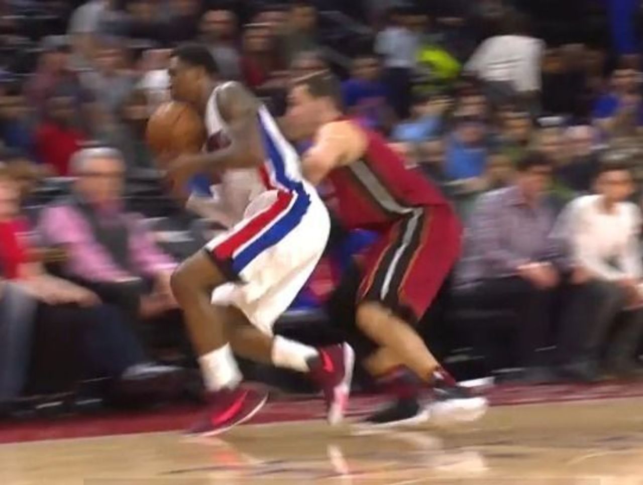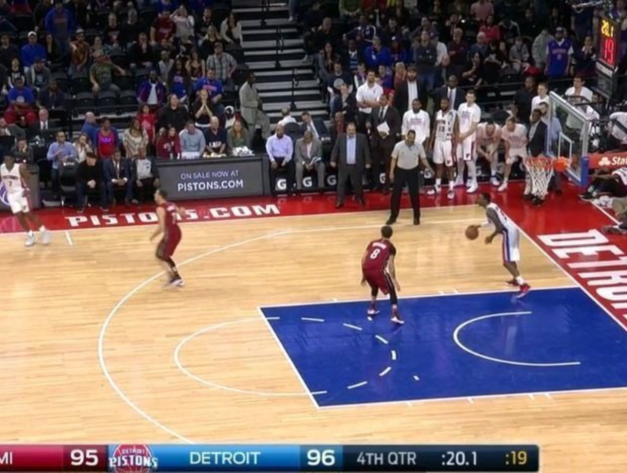 Miami's Johnson won the jump easily, tapping the ball to Dragic, who immediately turned and started sprinting upcourt along the sideline before the Pistons had a chance to trap. Caldwell-Pope swooped in and swiped the ball cleanly, but couldn't stay inbounds, aided perhaps by Dragic's forearm nudge to the back.