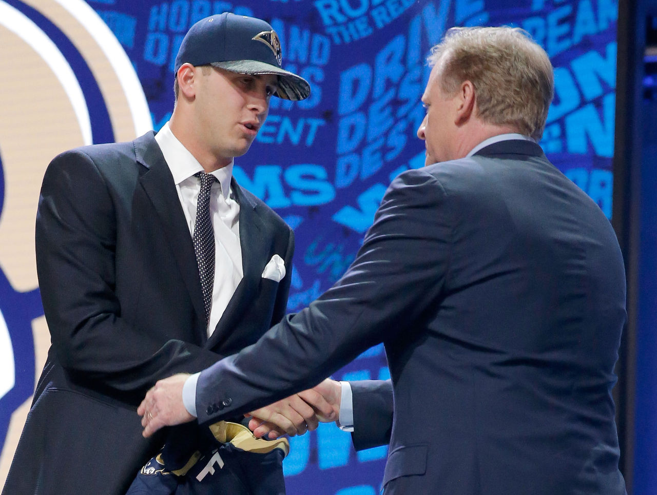 A year ago on Thursday, Roger Goodell walked onto the stage at Roosevelt University's Auditorium Theatre and pronounced, "With the first pick in the 2016 NFL Draft, the Los Angeles Rams select Jared Goff, quarterback, California."
