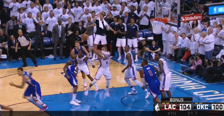 The Clippers held a 101-88 lead with four minutes remaining, but between some clock milking and subsequently poor possessions of their own and some Thunder baskets, they found themselves up just four points (101-97) with 1:24 remaining. Nonetheless, Serge Ibaka fouled Blake Griffin, who hit one free throw, and an offensive rebound on a missed Griffin free throw (By Glen Davis, of all people) led to what looked like a Chris Paul dagger that put the Clips up seven points (104-97) with 49 seconds to go.
