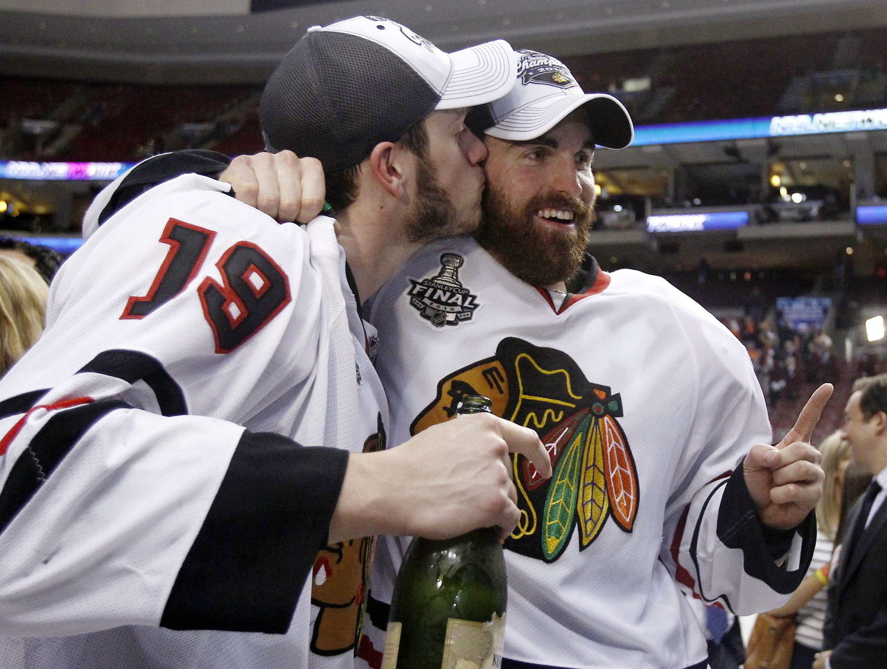 Though he'd climbed the highest pinnacle in professional hockey, Toews' beard remained incredibly weak. So instead he showed affection for Andrew Ladd's more impressive thigh tickler: