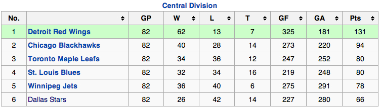 13 losses in 82 games, ho-hum. It was the Conference Finals where they ran into the Avs, who had the second most points during the regular season (104, not even close).
