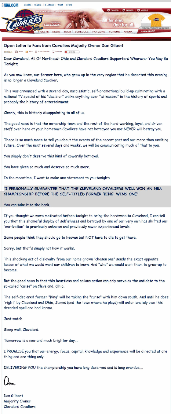 First, here's a cached copy of Cleveland Cavaliers owner Dan Gilbert's scathing letter. It was up as recently as July 6, 2014 (screen grab here).