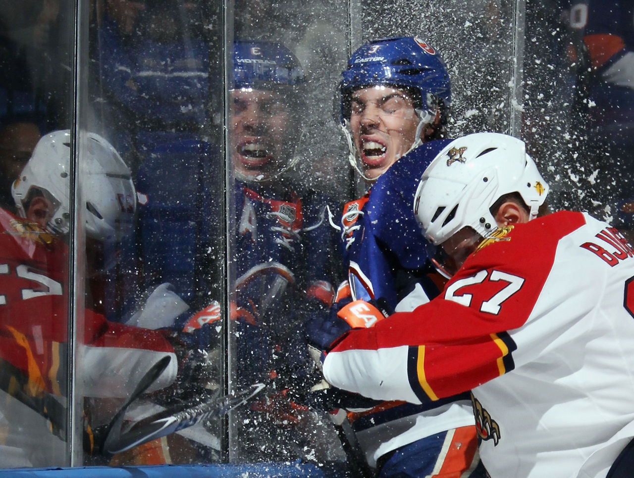 In one of the best action shots captured this season, Travis Hamonic of the New York Islanders displays what it's like to get hammered into the glass, courtesy of Florida Panthers forward Nick Bjugstad.