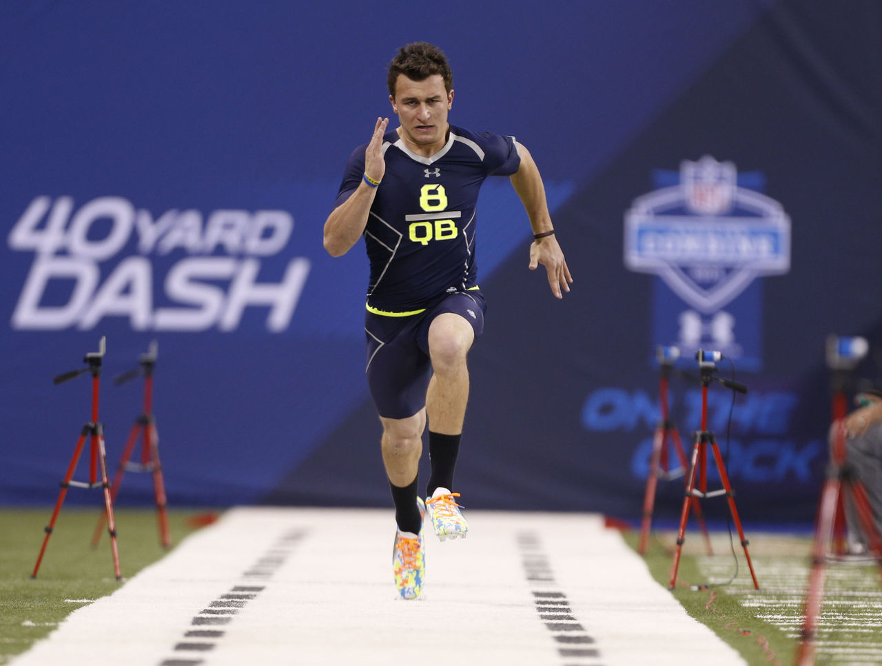Dressed in one of the most humiliating combine wardrobes committed to film, Tom Brady ran a 5.28 at the 2000 combine. Wearing what looks like a XXXL T-shirt and shorts made out of a reappropriated burlap sack, Brady beat only one non-lineman (QB Chris Redman - 5.37) in the foot race.