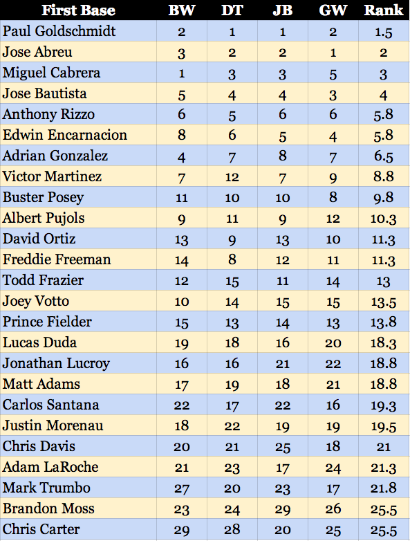 theScore's 2015 fantasy rankings apply to standard 10-team, 5x5 rotisserie leagues. Our MLB editors - Jonah Birenbaum, Dan Toman, Greg Warren and Brandon Wile - ranked 40 first basemen and the top 25 are listed below. Check out all of theScore's fantasy content for the upcoming season here.